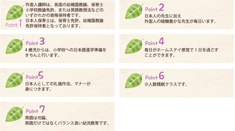 日本人の保育士に加え、ネイティブスピ-カーの先生がスクール に勤務しています。